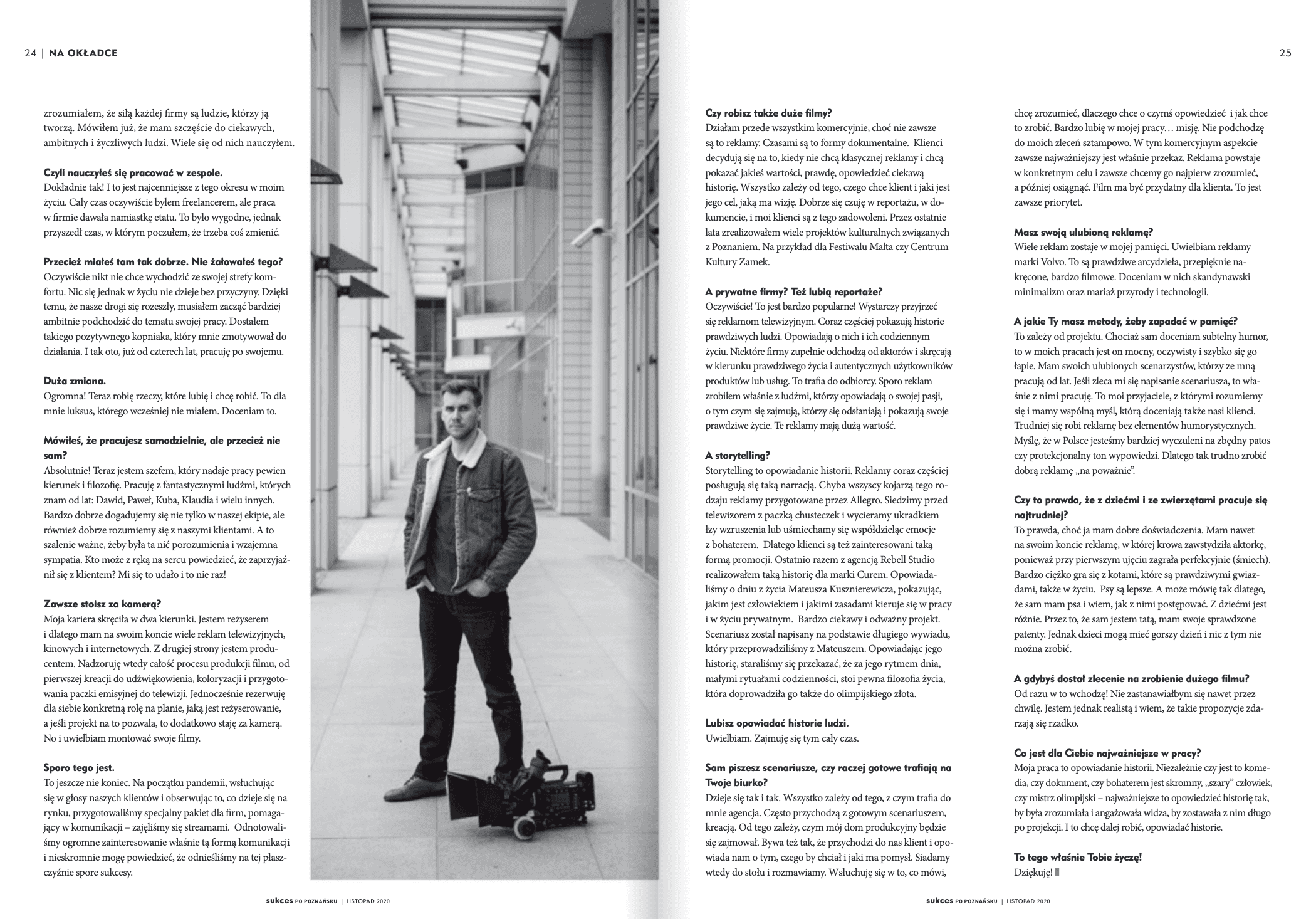 Staram się być godnym zaufania wyborem dla klientów szukających zaangażowanego reżysera o różnorodnych umiejętnościach, który potrafi na ekranie przekazać silne emocje związane z ich markami.